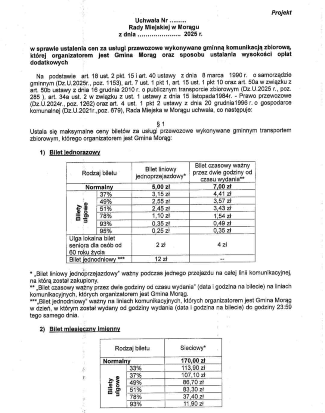 Cennik biletów – Publiczny Transport Zbiorowy Gminy Morąg
